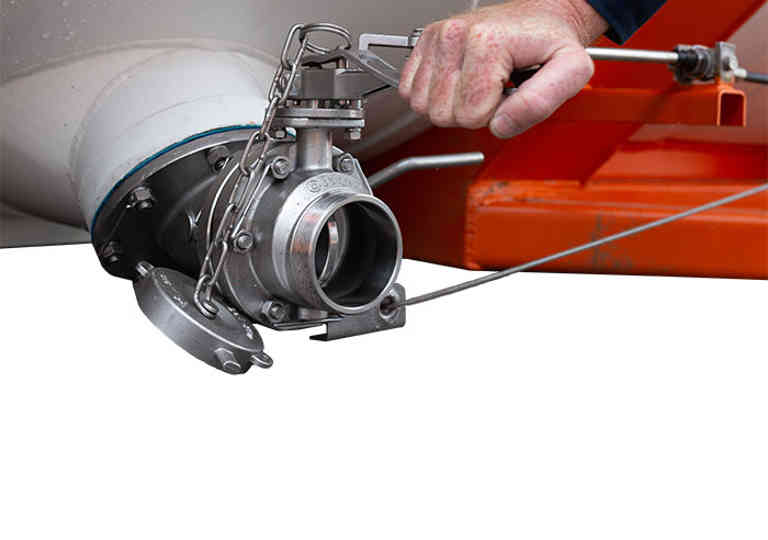 Most tanks are discharged through a butterfly or ball valve at the end of the container. The operator mounts the trailer, connects a hose and then releases the cargo into its next destination.
