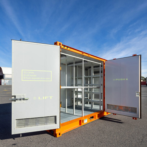 The 20ft Intrinsic Dangerous Goods container has internal emergency exits to ensure user safety, plus a gas sensor to activate an exhaust fan in the event of a spill.
