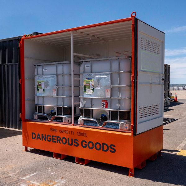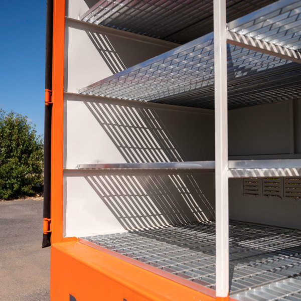 It can also be reconfigured for the storage of two IBC’s with shelving above the IBC’s for the additional storage of small packaged items.